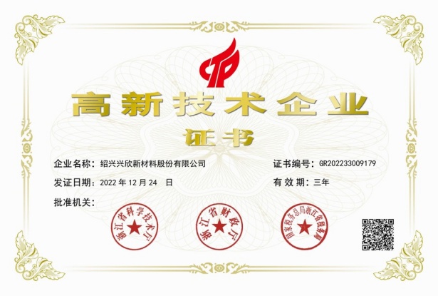 紹興興欣新材料股份有限公司成立于2002年06月27日,占地面積122畝,位于杭州灣上虞經(jīng)濟技術(shù)開發(fā)區(qū)拓展路2號,現(xiàn)有職工200余人,專業(yè)技術(shù)人員50余人;博士、碩士研究生30余人組成的一支知識型、專業(yè)化的技術(shù)科研團隊。公司面向全球市場,專業(yè)開發(fā)電子化學(xué)品、環(huán)保化學(xué)品、醫(yī)藥中間體、高分子材料等先進新材料重點領(lǐng)域的省級科技型企業(yè);建有浙江上虞、安徽東至兩個生產(chǎn)基地。目前為“國家高新技術(shù)企業(yè)”、浙江省“隱形冠軍”企業(yè)、浙江省專精特新中小企業(yè);建有“省級”研究開發(fā)中心,共建天津大學(xué)浙江紹興研究院電子化學(xué)品研發(fā)中心。